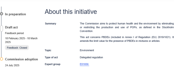 2025年7月24日,歐盟委員會(huì)通過了關(guān)于PBDEs的POPs修訂草案,該草案擬議對(duì)PBDEs(多溴二苯醚)管控限值進(jìn)行調(diào)整,后期歐盟將在其官方公報(bào)上正式發(fā)布修訂法規(guī)。