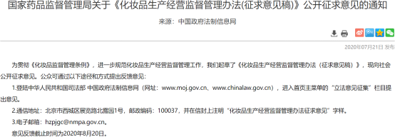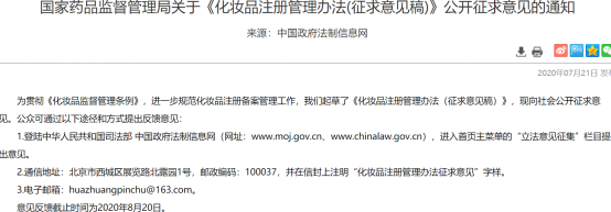 2020年07月21日,國家藥品監督管理局發布關于《化妝品生產經營監督管理辦法(征求意見稿)》和《化妝品注冊管理辦法(征求意見稿)》公開征求意見的兩項通知。意見反饋截止時間為2020年8月20日。
