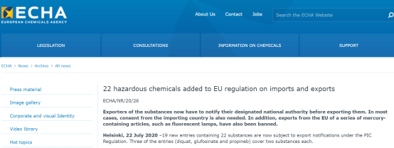2020年7月22日,歐盟將22種危險化學品加入進出口法規。根據事先知情同意條例,這22種物質須提交出口通知。