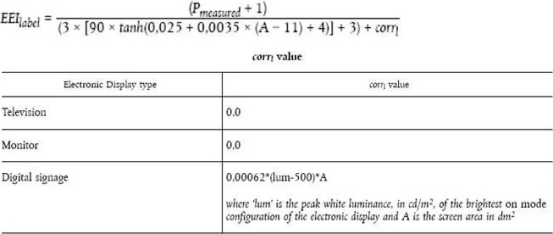 能效指數的計算公式如下:其中,Pmeasured是on mode模式下測得的消耗功率(W),A是屏幕面積(dm2),corr是修正因數(不適用于ABC功能加權的OLED電子顯示器是10,其他的是0)。