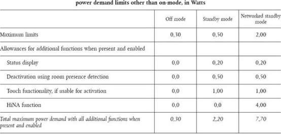 電子顯示器關機模式、待機模式和網絡待機模式的功耗,不能超過如下限值: