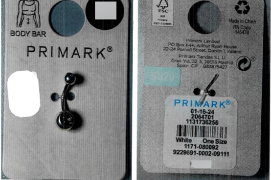 產品釋放出過量的鎳(每周測量值高達6.69μg/cm2)。鎳是強敏化劑,如果存在于與皮膚直接和長期接觸的物品中,會引起過敏反應。產品不符合REACH法規。
