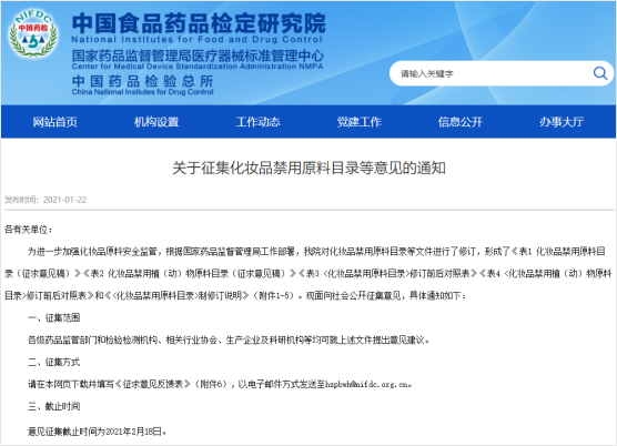 2021年1月22日,中國食品藥品檢定研究院在官網發布了《關于征集化妝品禁用原料目錄等意見的通知》。該通知明確,為進一步加強化妝品原料安全監管,根據國家藥品監督管理局工作部署,發布《化妝品禁用原料目錄(征求意見稿)》和《化妝品禁用植(動)物原料目錄(征求意見稿)》,并面向社會公開征集意見,截止日期為2021年2月18日。