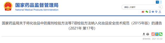 2021年3月2日,國家藥品監督管理局官網發布了化妝品祛斑美白功效測試等7項檢驗方法,作為《化妝品安全技術規范(2015年版)》(以下簡稱《規范》)修訂或新增的檢驗方法,納入《規范》相應章節。
