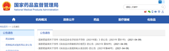 2021年4月9日,國家藥監局官網發布《化妝品分類規則和分類目錄》、《化妝品功效宣稱評價規范》、《化妝品安全評估技術導則(2021年版)》三則重要通告,并且都將從今年5月1日開始實施。