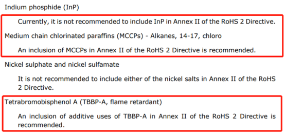 最終確定考慮擬將中鏈氯化石蠟(MCCP)和四溴雙酚A(TBBPA)納入RoHS的附錄II限制物質清單中,歐盟委員會隨后將會進行評議。