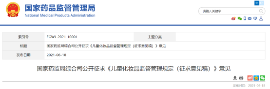 2021年6月18日,國(guó)家藥監(jiān)局在其官網(wǎng)發(fā)布了《兒童化妝品監(jiān)督管理規(guī)定(征求意見(jiàn)稿)》,并向社會(huì)公開(kāi)征求意見(jiàn)。目的是為規(guī)范兒童化妝品生產(chǎn)經(jīng)營(yíng)活動(dòng),加強(qiáng)兒童化妝品監(jiān)督管理,保障兒童用妝安全。