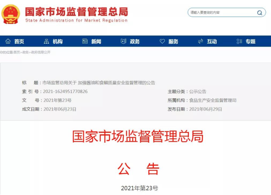 市場監管總局關于加強醬油和食醋質量安全監督管理的公告