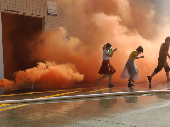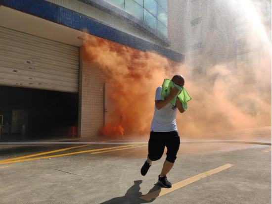 當聽到警報聲,事故樓層內的人員在疏散組的引導下,用濕毛巾捂住口鼻,彎著腰,緊張有秩序地從安全路線撤離,向安全區域集中;