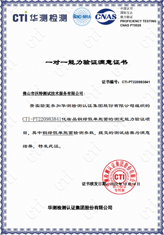 近日,佛山市沃特測試技術服務有限公司參加華測檢測認證集團股份有限公司組織的CTI-PT220983841化妝品銅綠假單胞菌的測定能力驗證活動,其中銅綠假單胞菌檢測參數,提交的測試結果為「滿意」結果。