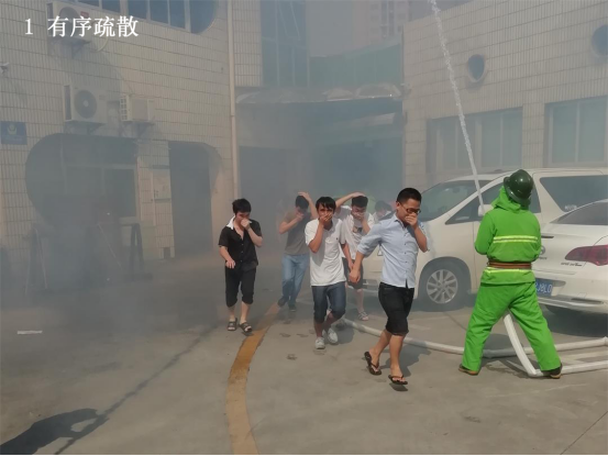 當聽到警報聲,事故樓層內的人員在疏散組的引導下,用濕毛巾捂住口鼻,彎著腰,緊張有秩序地從安全路線撤離,向安全區域集中;