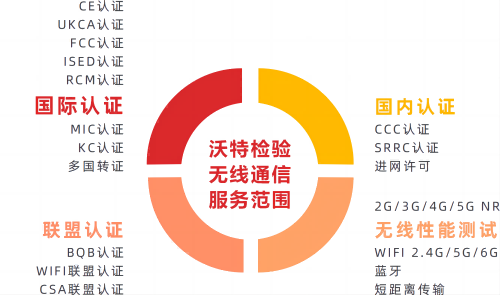 沃特檢驗集團建有專業的無線通信檢測實驗室,引進了業內先進的測試系統,可為無線產品提供SAR、EMC、Wi-Fi、藍牙、2G/3G/4G/5G NR、NB-IoT、eMTC (Cat.M1) 等專項性能檢測,并結合安規、化學、能效等測試能力,為客戶提供一站式、全方位的檢測認證及延伸服務,助力客戶產品出口全球市場。