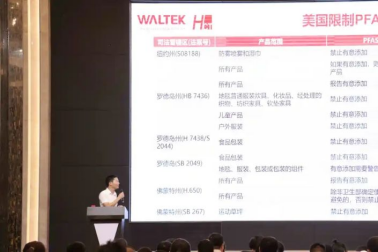 PFAS物質(zhì)因其所帶來的健康風(fēng)險,越來越引起了全球范圍內(nèi)的高度重視,關(guān)于PFAS的立法監(jiān)管和全面限制勢在必行。沃特檢驗集團虹彩公司黃宏黃工向現(xiàn)場企業(yè)介紹了美國、歐盟、中國、日本等多個國家/地區(qū)最新的PFAS管控要求及市場動態(tài),并展示了沃特的PFAS測試能力已升級至193項,覆蓋行業(yè)常用的PFAS物質(zhì),涉及更全面的法規(guī)要求。