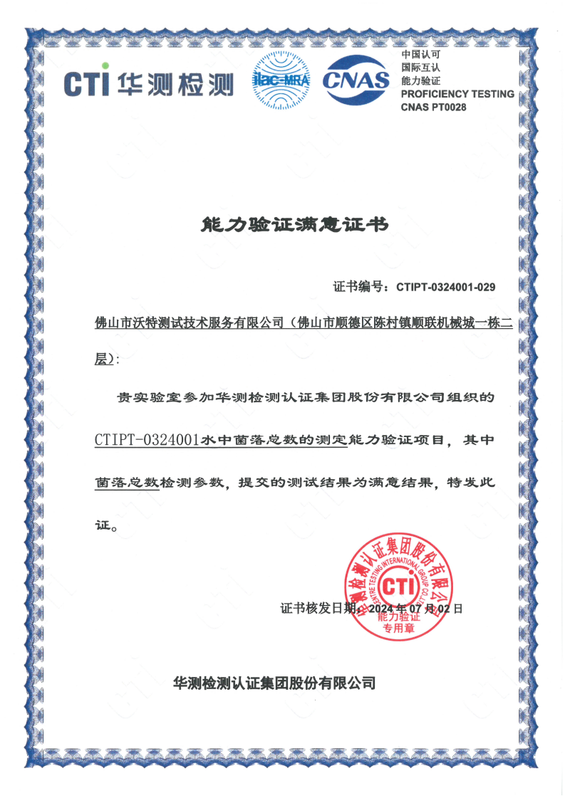 佛山沃特參加CTIPT-0324001水中菌落總數(shù)的測定能力驗證 獲“滿意”結(jié)果