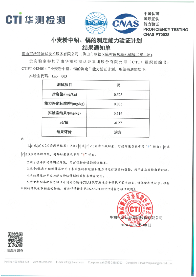 佛山沃特參加CTIPT-0424014小麥粉中鎘的測定能力驗(yàn)證 獲“滿意”結(jié)果