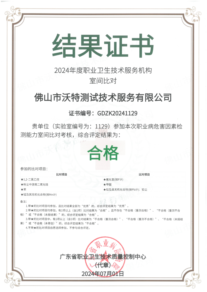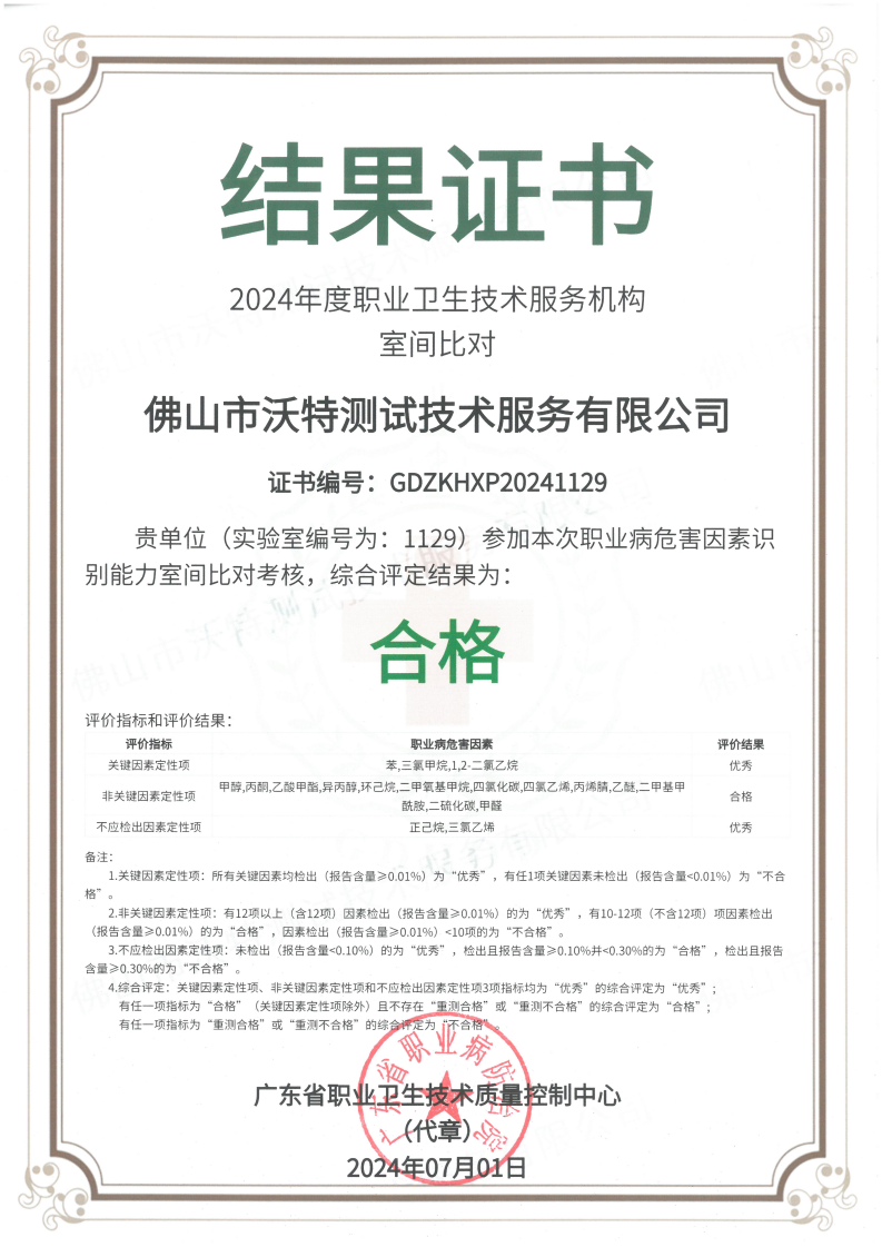 近日,佛山市沃特測(cè)試技術(shù)服務(wù)有限公司(以下簡稱“佛山沃特”)參加了廣東省職業(yè)衛(wèi)生技術(shù)質(zhì)量控制中心組織開展的2024年度職業(yè)衛(wèi)生技術(shù)服務(wù)機(jī)構(gòu)室間比對(duì)(職業(yè)病危害因素識(shí)別能力、檢測(cè)能力)考核,綜合評(píng)定結(jié)果均為“合格”。