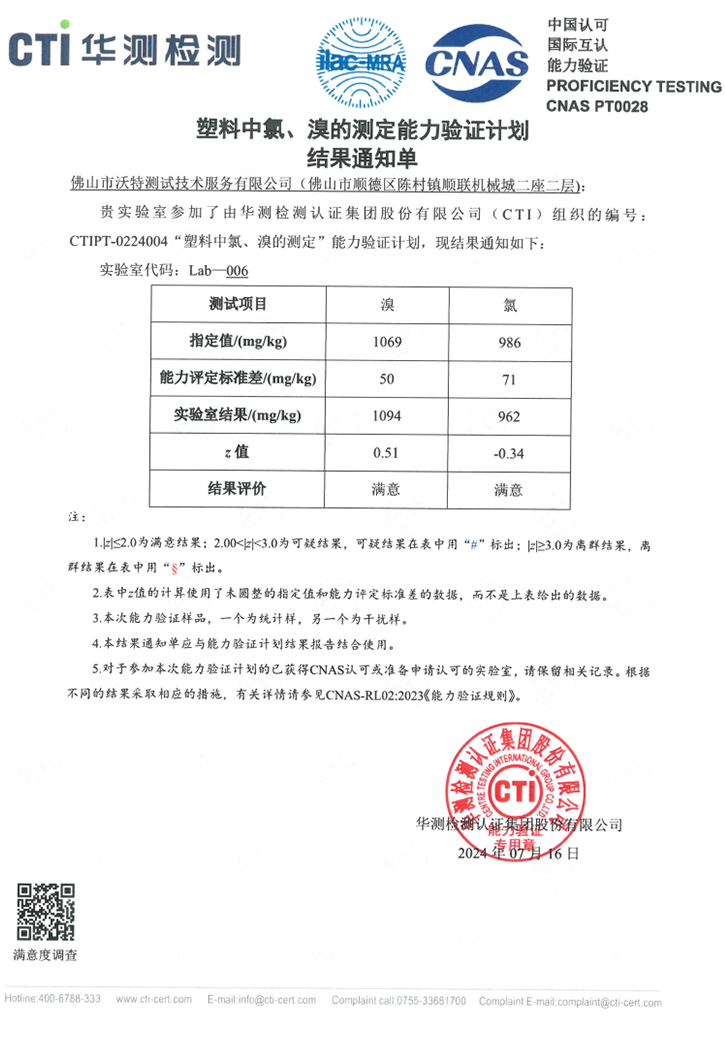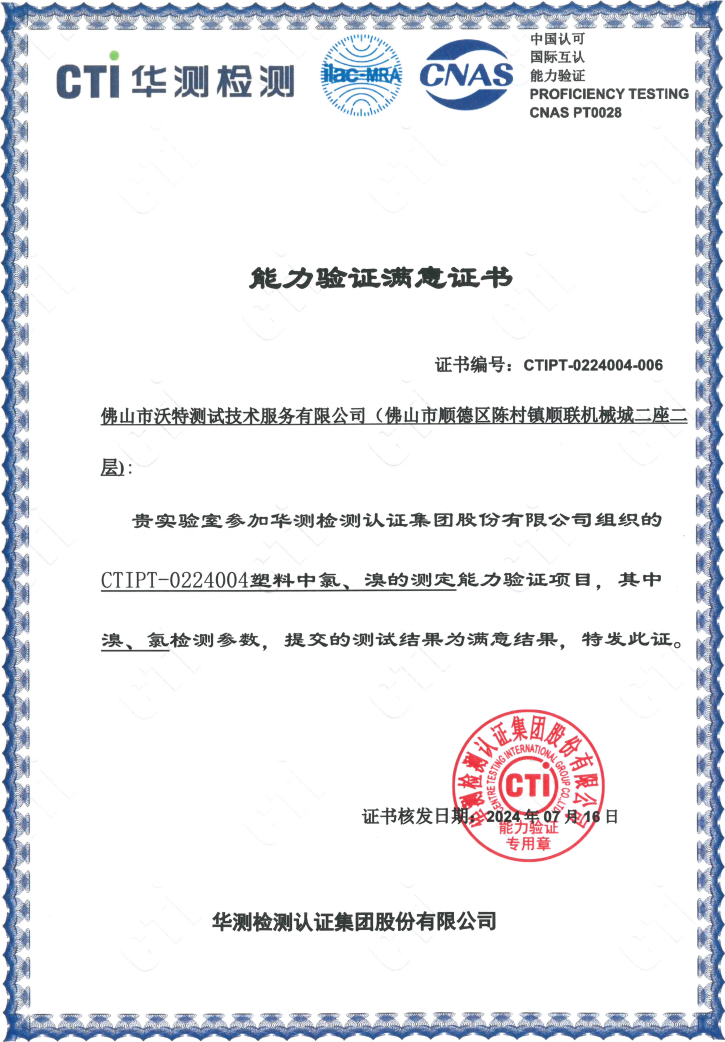 近日,佛山市沃特測試技術服務有限公司(以下簡稱“佛山沃特”)參加華測檢測認證集團股份有限公司組織的CTIPT-0224004塑料中氯、溴的測定能力驗證項目,其中溴、氯檢測參數,提交的測試結果為滿意。