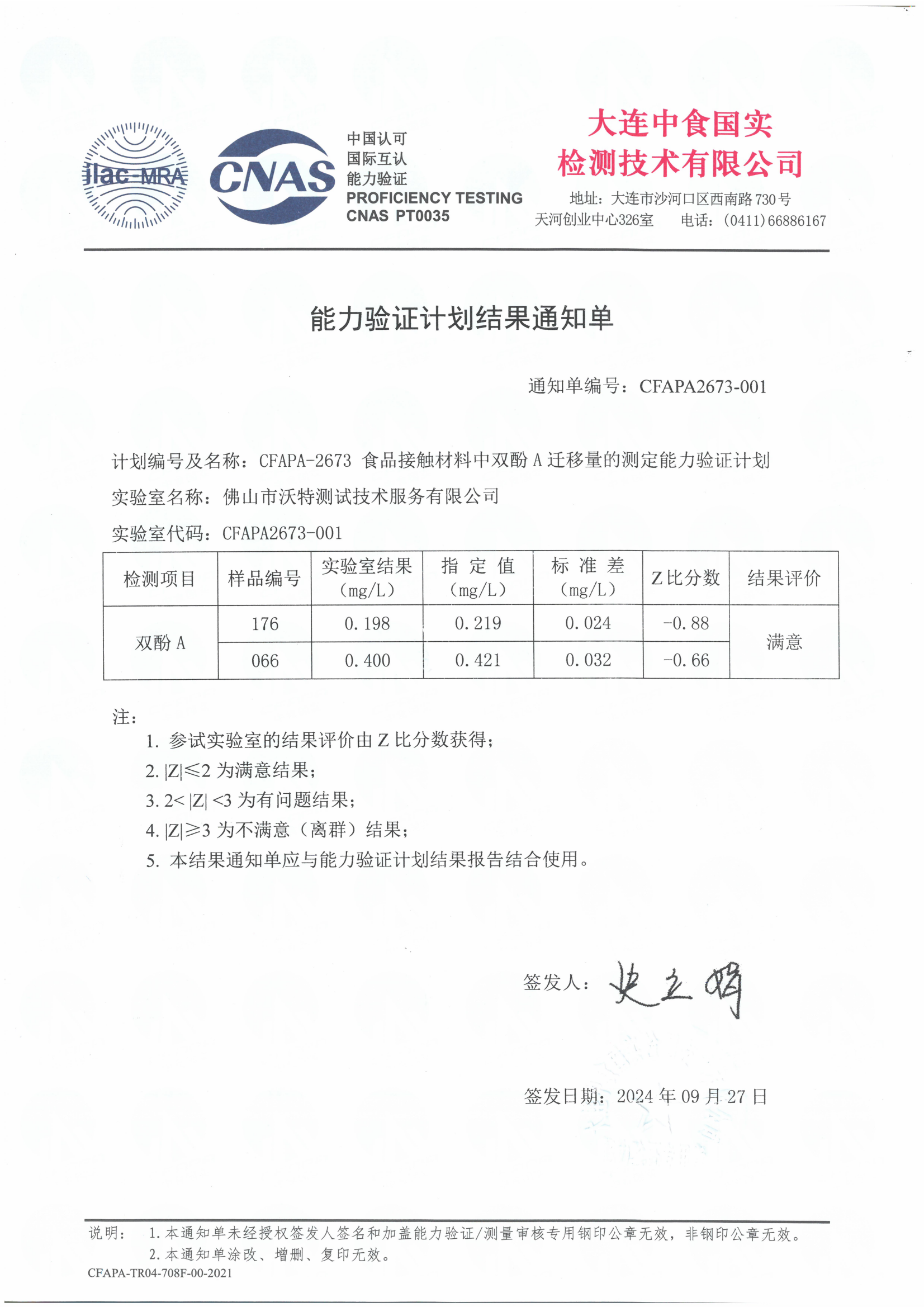 近日,佛山市沃特測試技術服務有限公司(以下簡稱“佛山沃特”)參加大連中食國實檢測技術有限公司組織的CFAPA-2673食品接觸材料中雙酚A遷移量的測定能力驗證計劃,其中雙酚A檢測參數,結果評價為滿意。