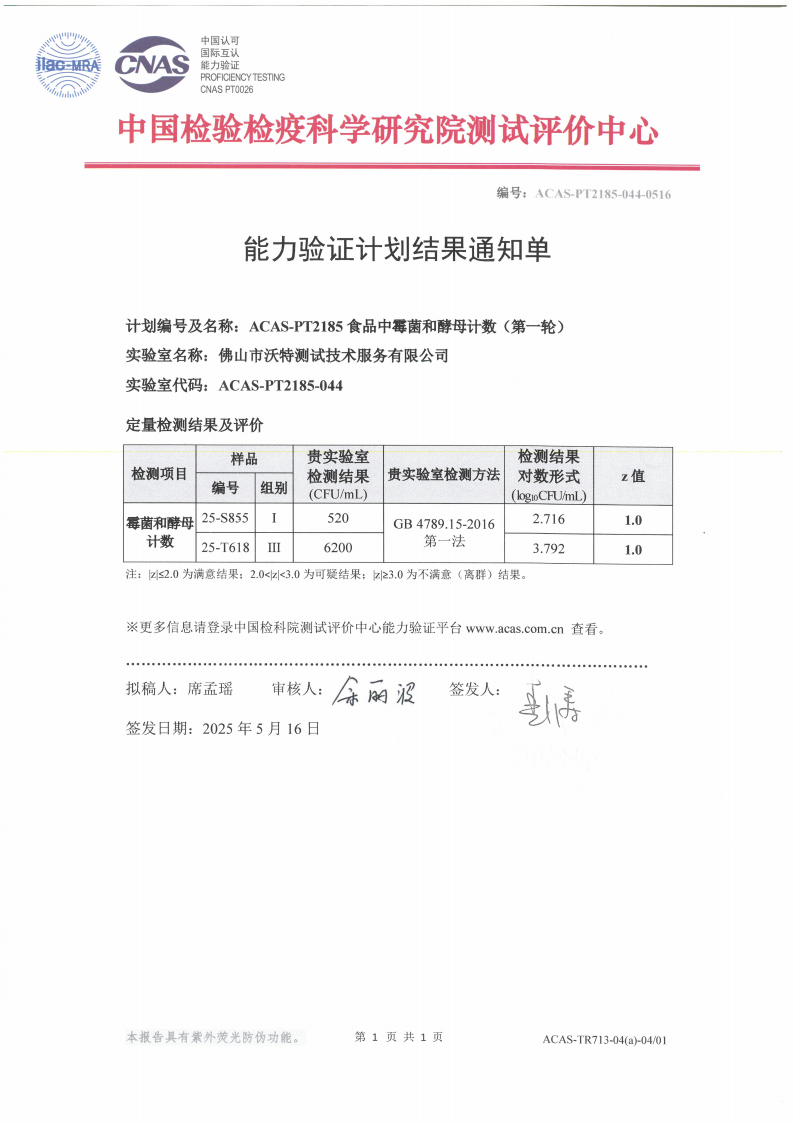 近日,佛山市沃特測試技術服務有限公司(以下簡稱“佛山沃特”)參加中國檢驗檢疫科學研究院測試評價中心組織的ACAS-PT2185 食品中霉菌和酵母計數(第一輪)能力驗證計劃,其中霉菌和酵母計數檢測項目,結果評價為滿意。