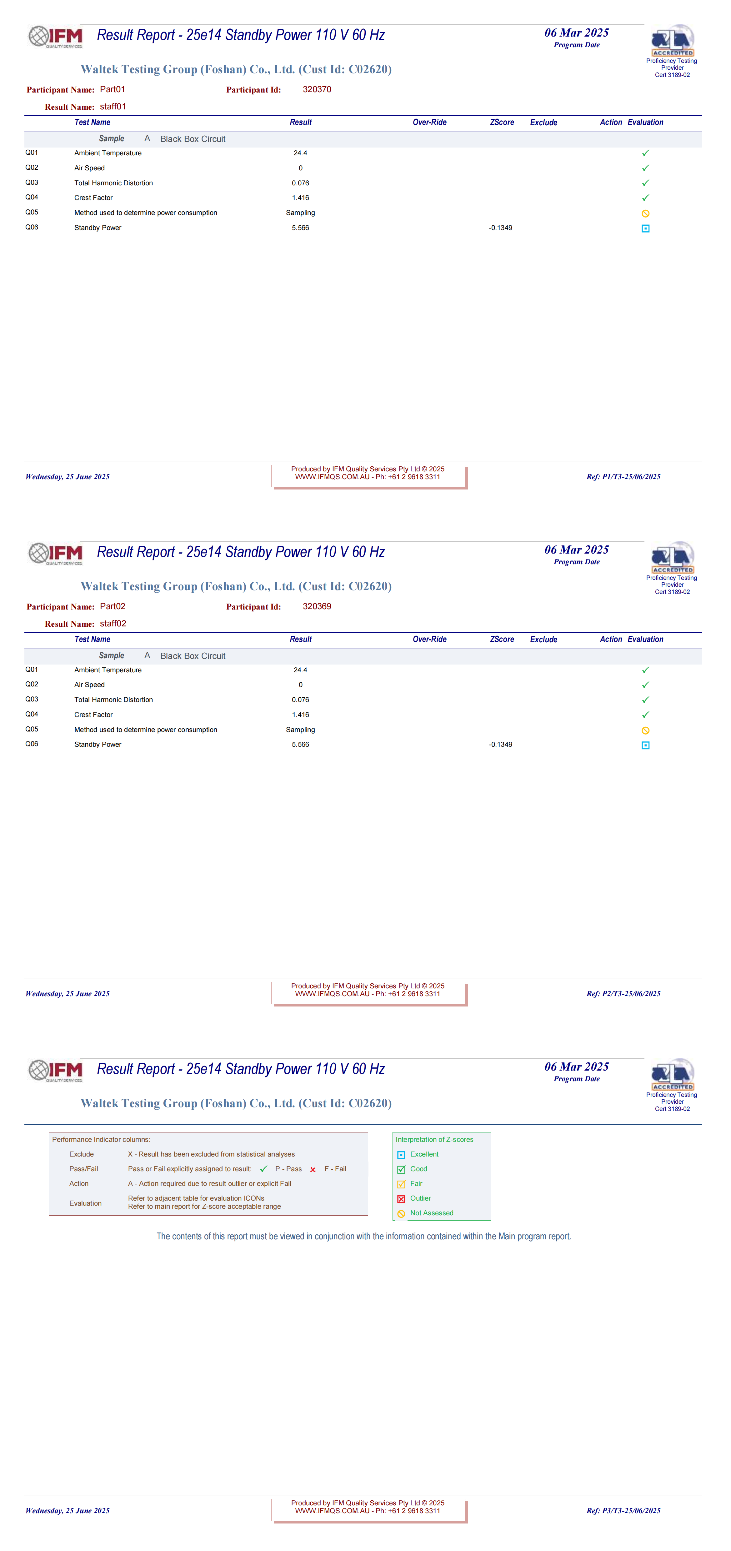 近期,沃特檢驗集團佛山公司(以下簡稱“佛山沃特”)參加國際能力驗證機構IFM組織的25e14 standby power 230V 50Hz; 110V 60Hz能力驗證試驗,均獲得了“滿意”結果。