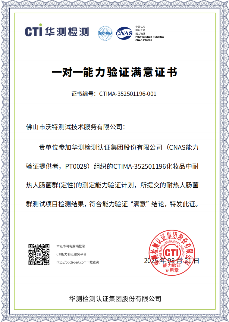 近日,佛山市沃特測(cè)試技術(shù)服務(wù)有限公司(以下簡(jiǎn)稱(chēng)“佛山沃特”)參加華測(cè)檢測(cè)認(rèn)證集團(tuán)股份有限公司組織的CTIMA-352501196“化妝品中耐熱大腸菌群(定性)的測(cè)定”能力驗(yàn)證計(jì)劃,所提交的耐熱大腸菌群測(cè)試項(xiàng)目檢測(cè)結(jié)果,符合能力驗(yàn)證“滿意”結(jié)論。