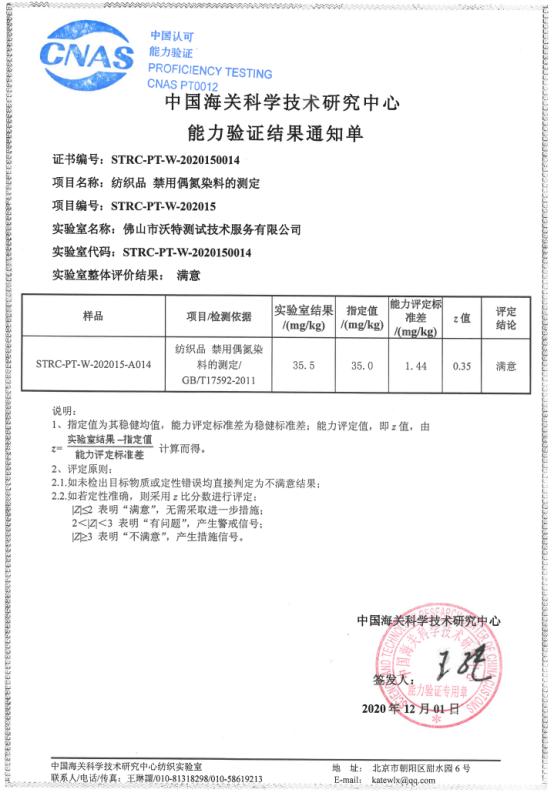 近日,沃特檢驗集團佛山分公司參加中國海關科學技術研究中心STRC-PT-W-202015紡織品禁用偶氮染料的測定能力驗證,并獲得滿意結果。