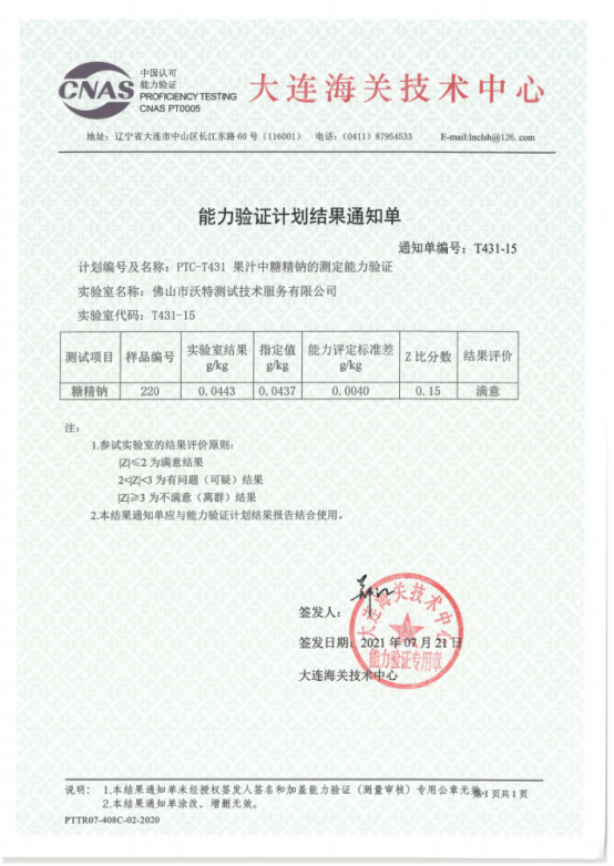 佛山沃特參加果汁中糖精鈉測定等三項食品測定能力驗證獲得滿意結果