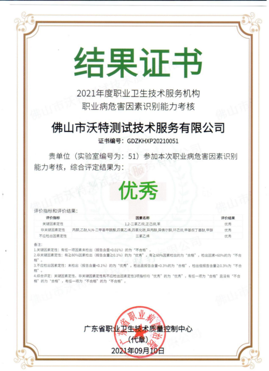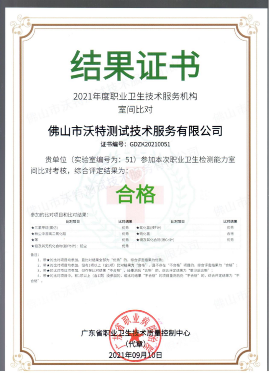 佛山沃特參加2021年度職業(yè)衛(wèi)生技術服務機構室間比對、職業(yè)病危害因素識別能力考核 評定「優(yōu)