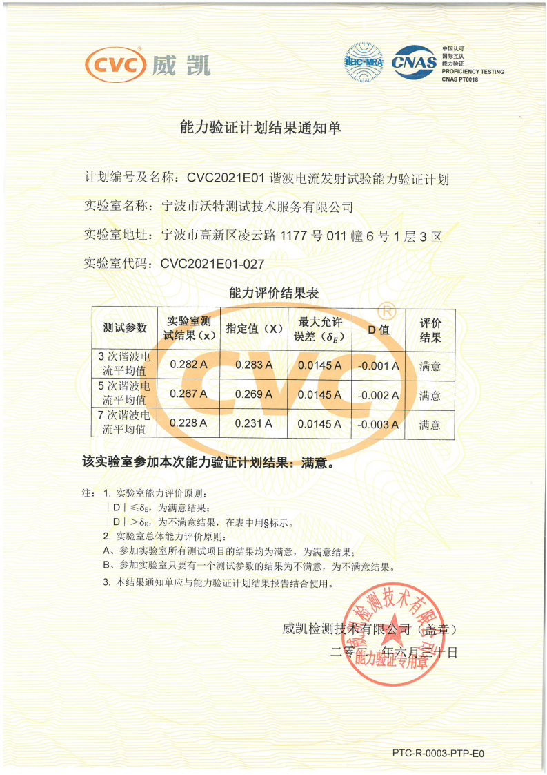 寧波沃特參加諧波電流等三項能力驗證計劃獲得「滿意」結果