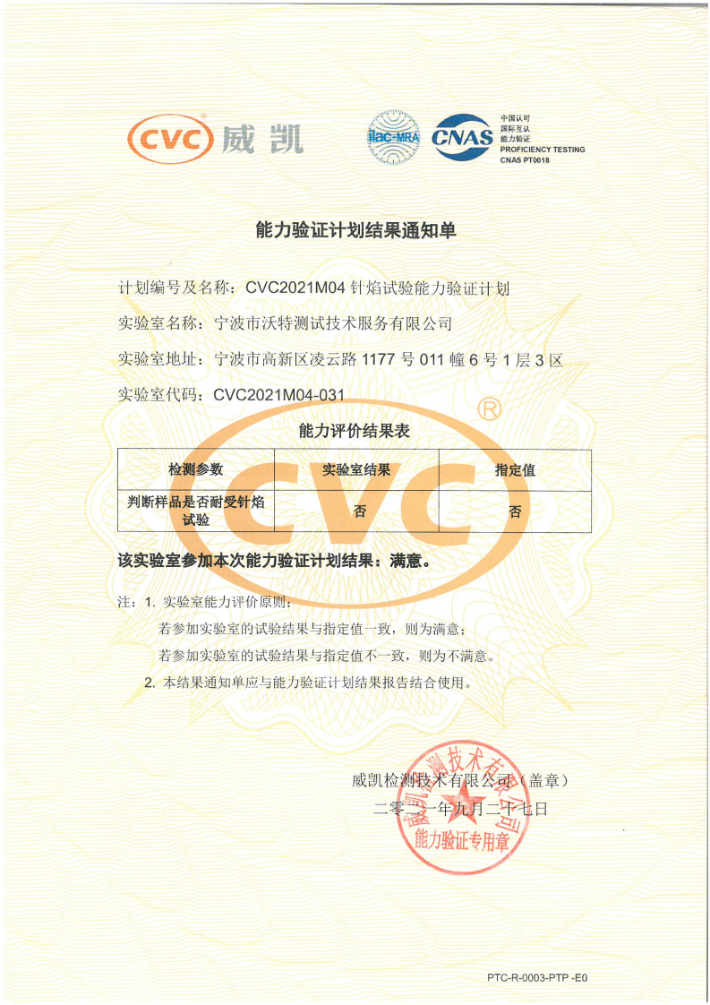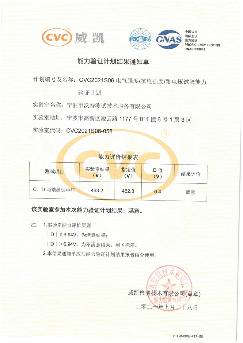 今年,寧波市沃特測試技術服務有限公司參加了CVC2021E01 諧波電流, CVC2021S06 電氣強度試驗, CVC2021M04 針焰試驗共3項能力驗證計劃,均獲得了“滿意”結果。